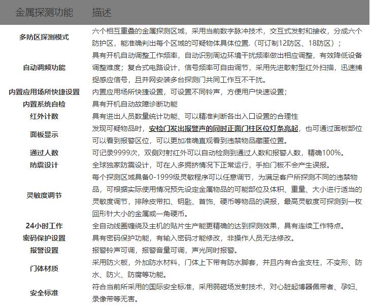 遠距離高精度人體測溫安檢門,集帶人體溫度檢測和金屬探測為一體的安全檢測門,門頭裝有高精度的體溫檢測探頭,探測角度可以上下移動, 能夠測量人體額頭的表面溫度,然后根據人體額頭的溫度與體溫的關系得到人體的實際體溫。檢測儀的光學組件將額頭發射和反射的能量匯集到傳感器上,通過電子組件將此信息轉化成溫度讀數并顯示在顯示面板上,當溫度讀數超過高溫報警值時,儀器會發出報警聲.報警溫度可隨意設置.具有防水、防火、防腐等特點。適用于管制刀具和槍支等危險品的安全檢查,廣泛應用于適用于機場,車站,出入境檢查站,等人員密集場所。是防止疫情擴散的有效手段。