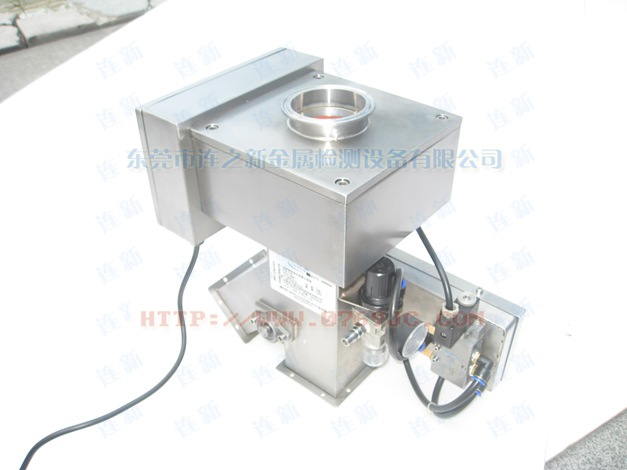 原料從料斗或送料器自由下落進(jìn)入金屬分離器,如果沒有金屬雜質(zhì),原料會(huì)直接通過金屬分離器流向下端的出料口。如果檢測器檢測到原料中含有金屬,那么控制器立刻啟動(dòng)分離板將金屬物和部分原料一起導(dǎo)向側(cè)面的排料口,然后分流板迅速恢復(fù)至正常的位置,分流板速度可調(diào),金屬分離器的檢測精度也可根據(jù)生產(chǎn)需要調(diào)節(jié),最小可檢測并分離出Φ 0.2mm的金屬顆粒。